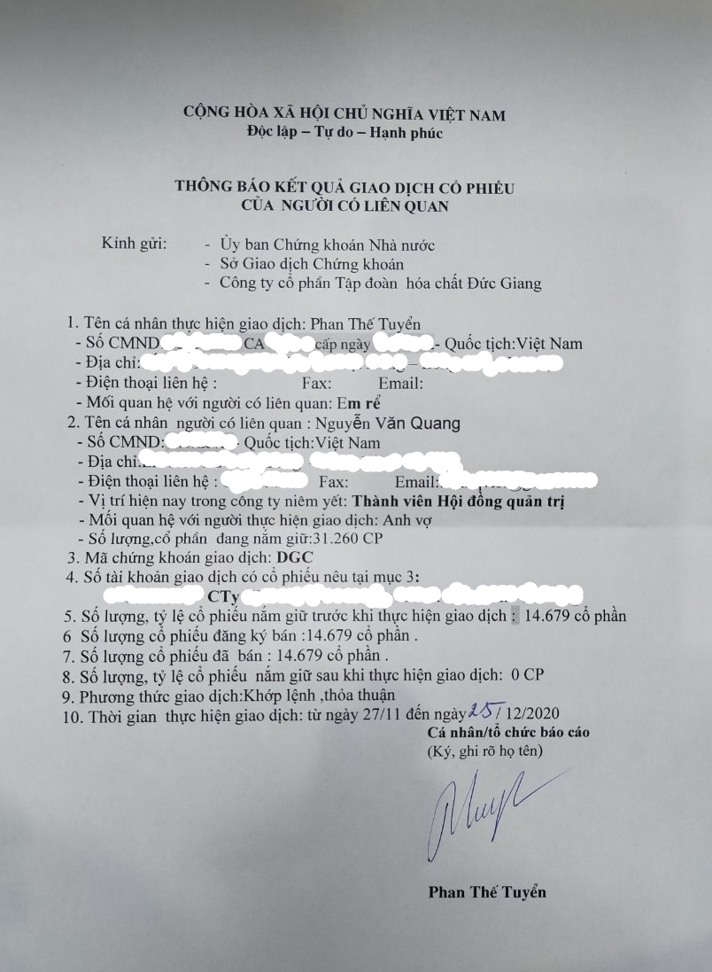BÁO CÁO KẾT QUẢ GIAO DỊCH CỦA NGƯỜI CÓ LIÊN QUAN NGƯỜI NỘI BỘ Đã đăng vào 26/12/202026/12/2020 admin-ducgiangPosted in Công Bố Thông Tin, Quan hệ cổ đông Báo cáo kết quả giao dịch cổ phiếu của ông Phan Thế Tuyển – Người có liên quan của ông Nguyễn Văn Quang – Thành viên Ban Kiểm soát Công ty CP Tập đoàn Hóa chất Đức Giang. Cùng chuyên mục CBTT NGHỊ QUYẾT HĐQT 12 THÔNG QUA ĐIỀU CHỈNH GCN ĐẦU TƯ DỰ ÁN NGHI SƠN CBTT NGHỊ QUYẾT HĐQT 11 THÔNG QUA GIẢI TỎA CỔ PHIẾU ESOP 2022 CBTT BÁO CÁO TÀI CHÍNH SOÁT XÉT BÁN NIÊN 2025