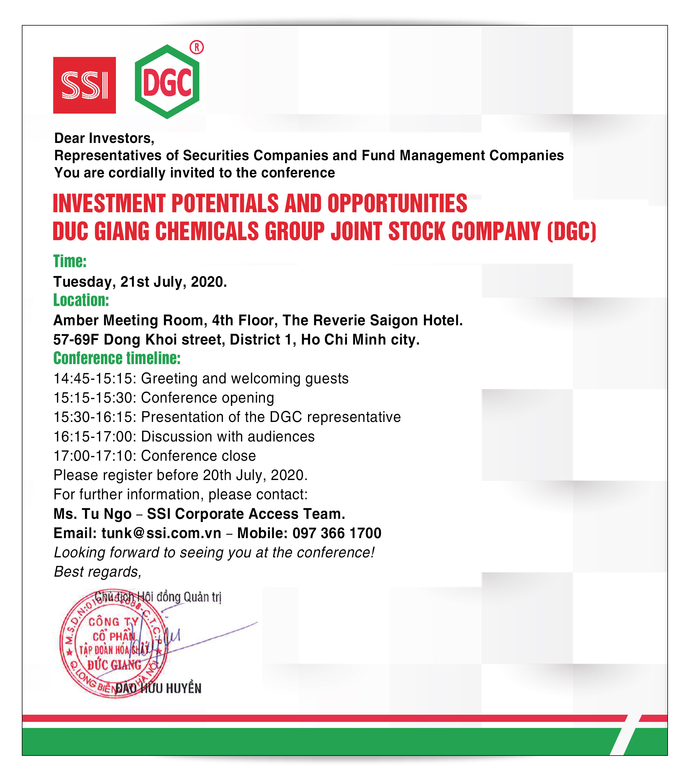 In order to learn more about the potential future big projects of Duc Giang Chemical Group, we would like to respect the new investors, representatives of securities companies and fund management companies. domestic and foreign credit to the seminar with the theme: “DGC – Potentials & Investment Opportunities”.