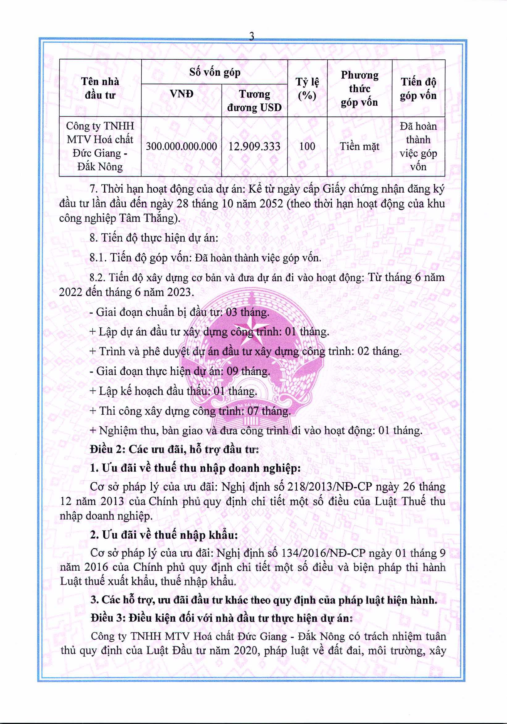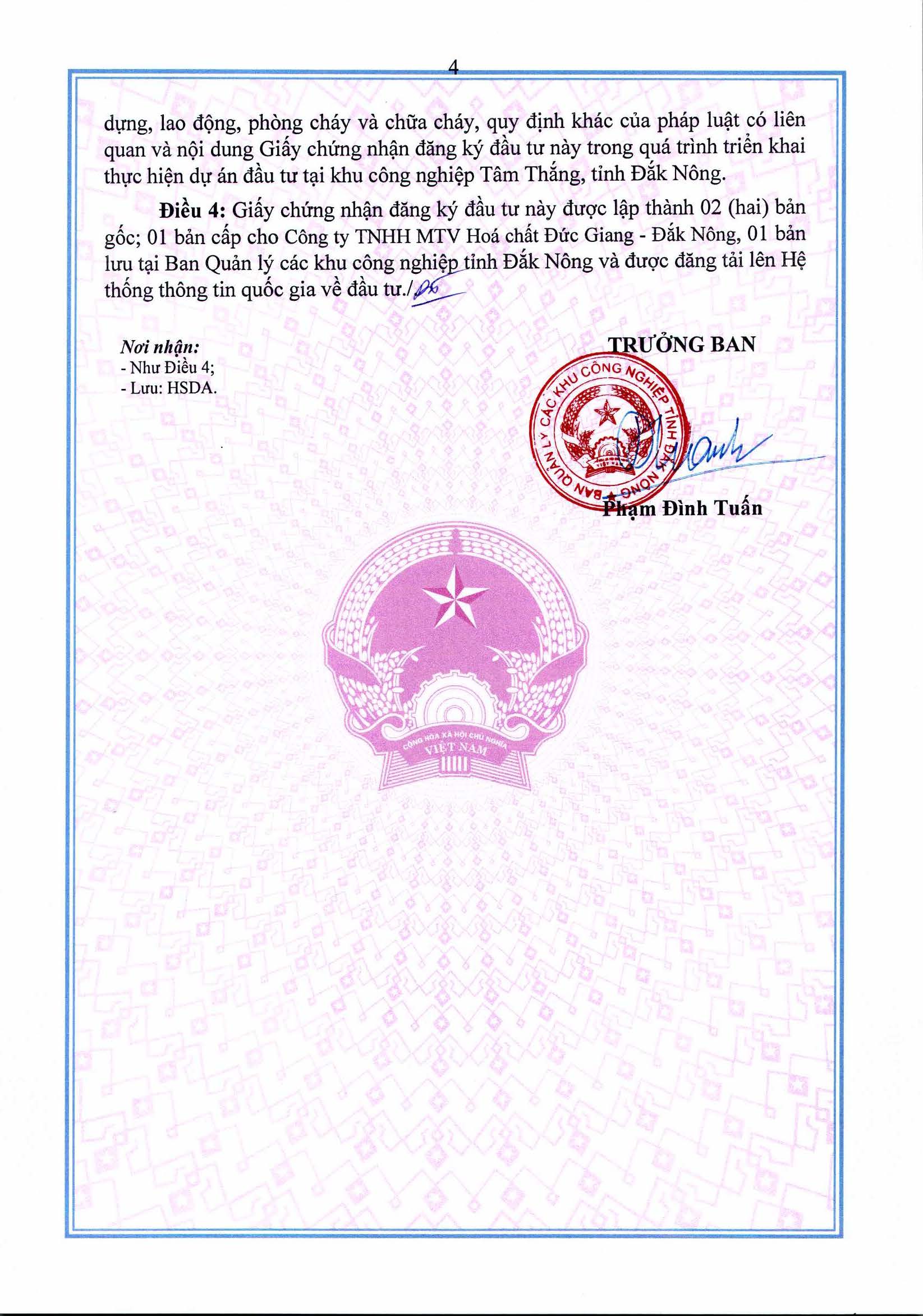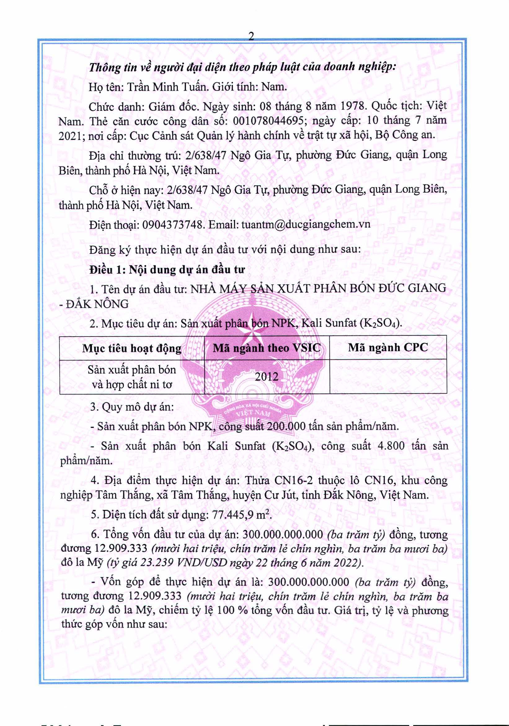 Ngày 22 tháng 6 năm 2022, Tập Đoàn Hóa Chất Đức Giang đã chính thức được cấp Giấy chứng nhận đăng ký đầu tư xây dựng dự án nhà máy sản xuất phân bón Đức Giang-Đắk Nông. Dự án có vị trí tại lô CN 16 -2 KCN Tâm Thắng, xã Tâm Thắng, Huyện Cư Jút, tỉnh Đắk Nông. Đây là một trong những dự án lớn của tỉnh Đắk Nông, vừa nâng cao vị thế của Tập đoàn đồng thời góp phần vào sự phát triển công nghiệp chung của tỉnh trong thời gian này..