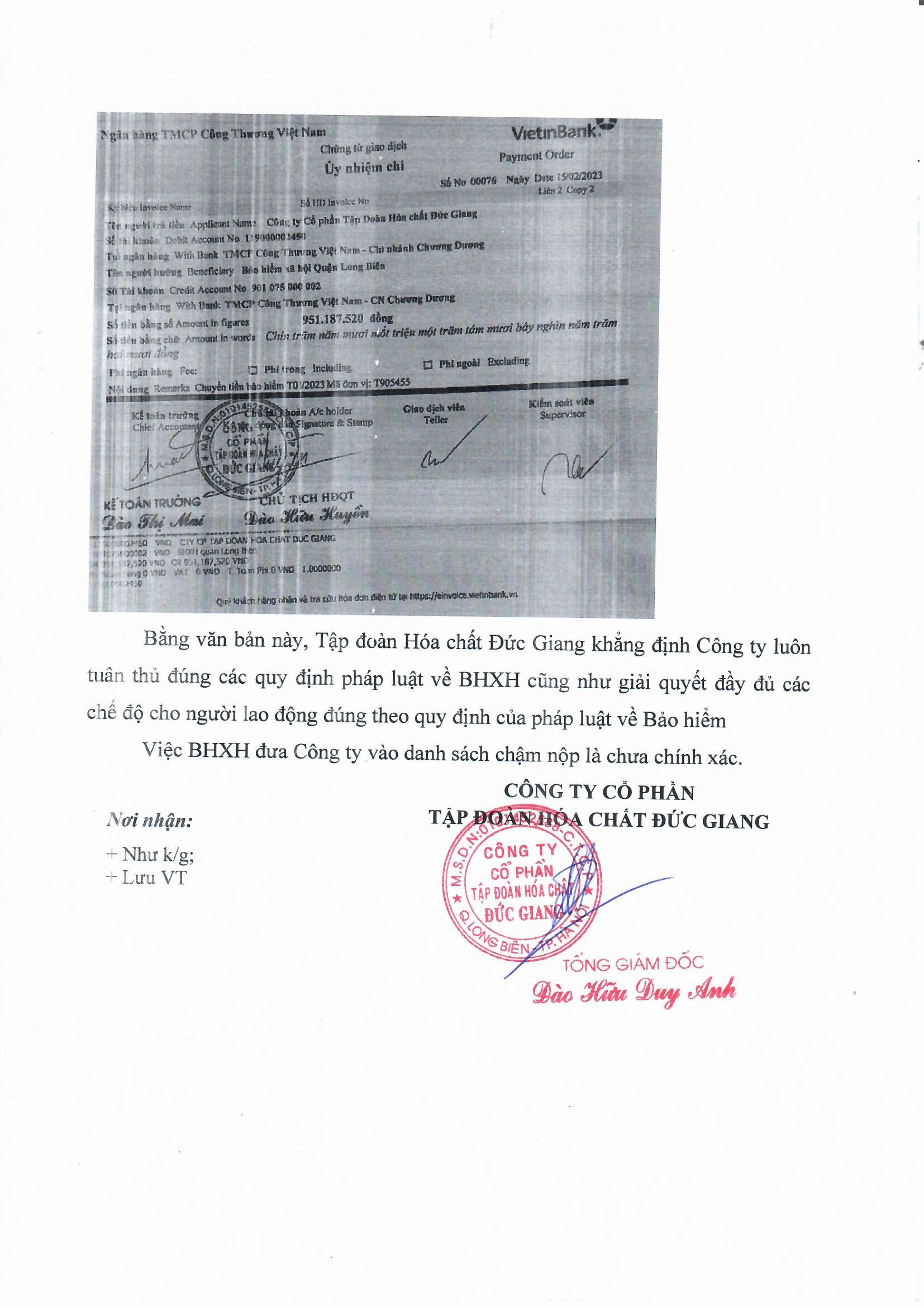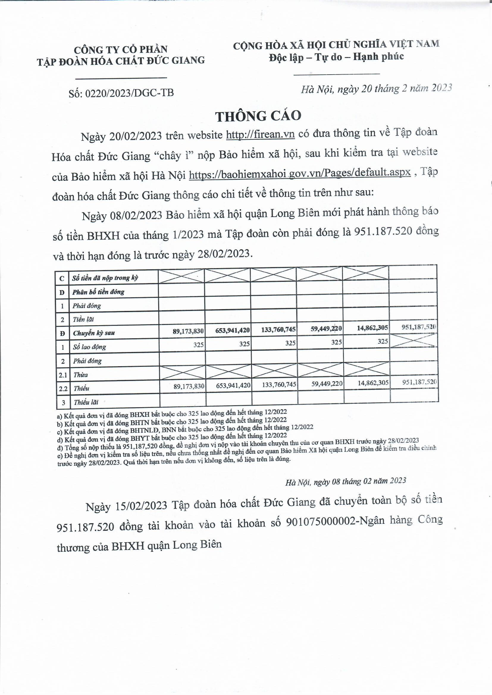 Thông Báo Đã đăng vào 21/02/202321/02/2023 admin-ducgiangPosted in Công Bố Thông Tin, Quan hệ cổ đông, Tin nổi bật, Tin tức Cùng chuyên mục CBTT NGHỊ QUYẾT HĐQT 12 THÔNG QUA ĐIỀU CHỈNH GCN ĐẦU TƯ DỰ ÁN NGHI SƠN CBTT NGHỊ QUYẾT HĐQT 11 THÔNG QUA GIẢI TỎA CỔ PHIẾU ESOP 2022 Dấu ấn Hóa Chất Đức Giang tại Triển lãm Thành tựu 2025 – Hành trình cùng đất nước vươn tầm