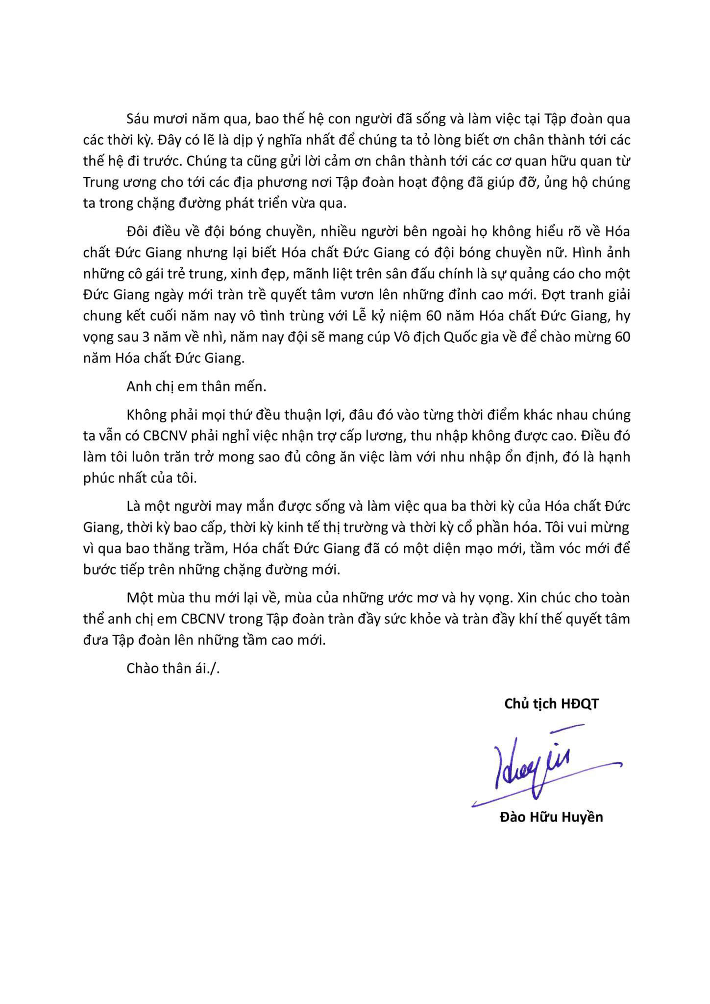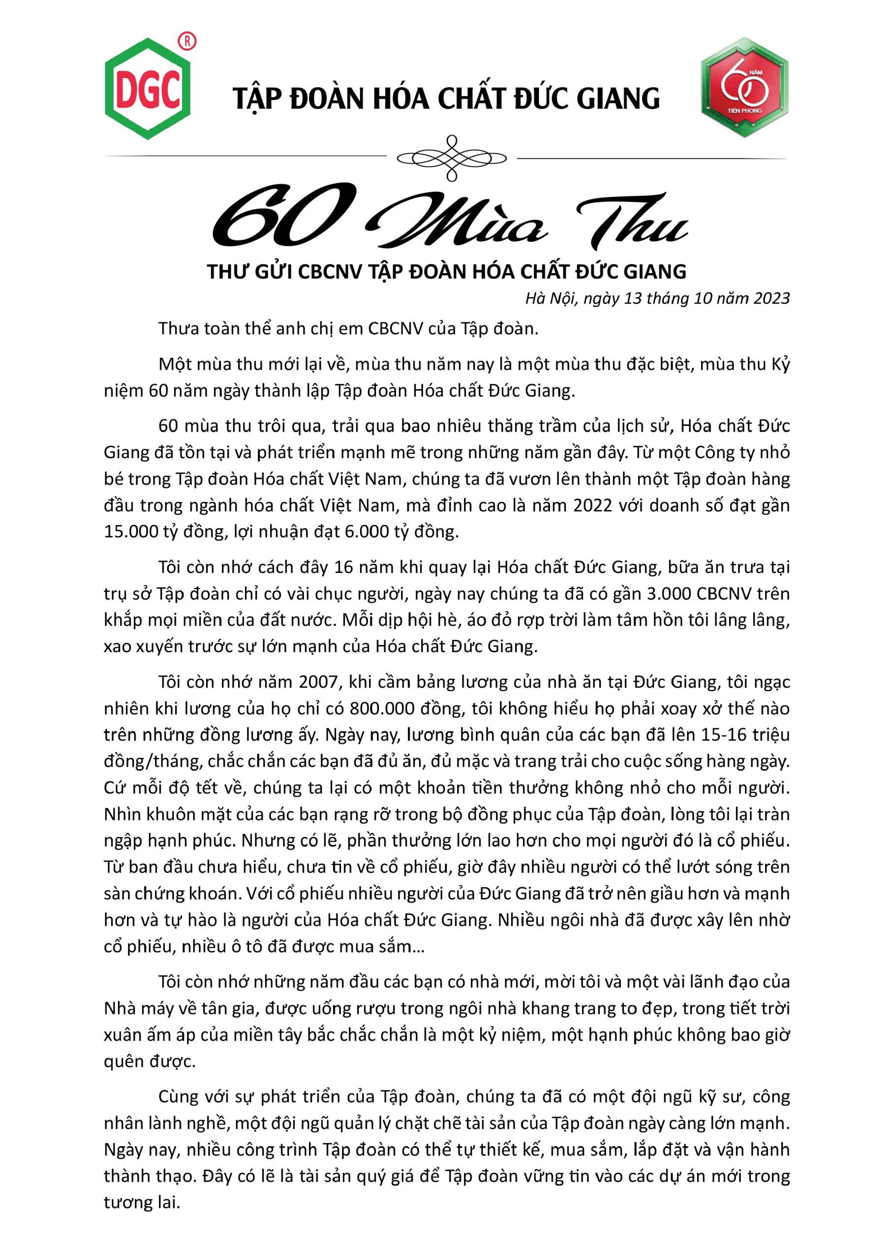(Tiếng Việt) Thư gửi CBCNV Tập Đoàn Hóa Chất Đức Giang nhân dịp kỷ niệm 60 năm ngày thành lập (8/11/1963-8/11/2023) Posted on Friday October 13th, 2023Friday October 13th, 2023 admin-ducgiangPosted in Tin nổi bật, News Sorry, this entry is only available in Vietnamese. Related post (Tiếng Việt) CBTT NGHỊ QUYẾT HĐQT 12 THÔNG QUA ĐIỀU CHỈNH GCN ĐẦU TƯ DỰ ÁN NGHI SƠN (Tiếng Việt) CBTT NGHỊ QUYẾT HĐQT 11 THÔNG QUA GIẢI TỎA CỔ PHIẾU ESOP 2022 Duc Giang Chemicals at the 2025 Achievements Exhibition – Advancing Together with the Nation