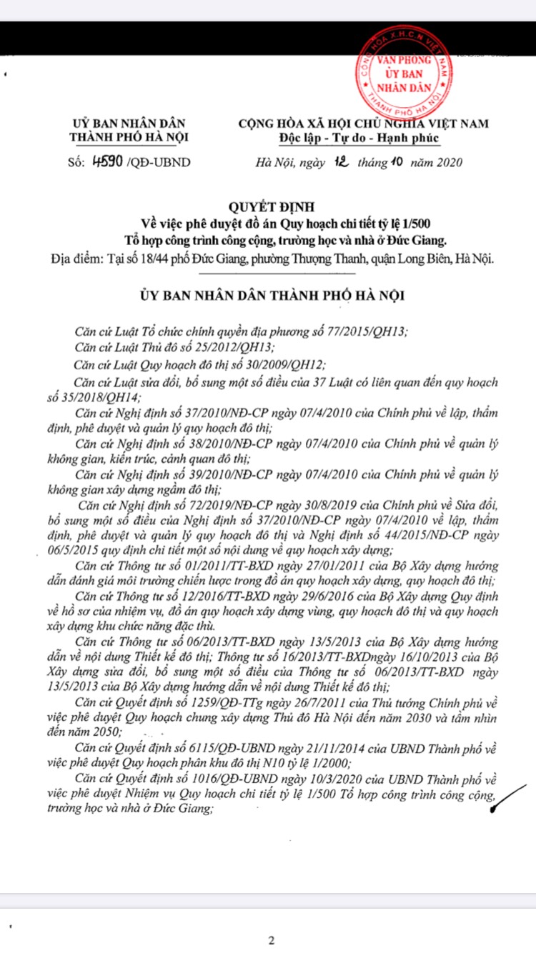 Ngày 12/10/2020, Ủy ban Nhân dân TP Hà Nội đã ký Quyết định số 4590/QĐ-UB về việc phê duyệt đồ án Quy hoạch chi tiết tỷ lệ 1/500 Tổ hợp công trình công cộng, trường học và nhà ở Đức Giang tại địa chỉ số 18/44 phố Đức Giang, phường Thượng Thanh, quận Long Biên, Hà Nội.